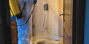 Désinfection en action dans la salle de bain suite a un suicide